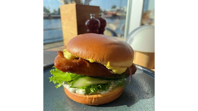 Café Bryggen tilbyder fiskefilétburger med fritter for 139 kr. så længe lager haves