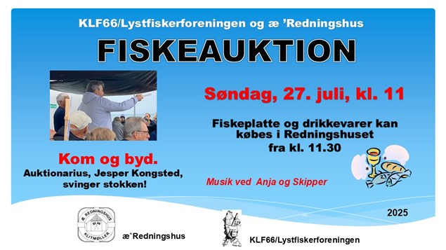 Den traditionsrige fiskeauktion i Klitmøller er en begivenhed, som mange ser frem til hvert år. Med Jesper Kongsted fra Hanstholm Fiskeauktion ved roret, er der garanti for en underholdende auktion, hvor der bydes på friskfangede fisk i Lystfiskernes Kassehus.