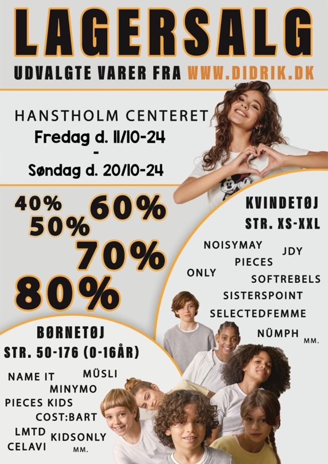 Gør dig klar til et fantastisk lagersalg med store besparelser på kendte danske mærker. Fra fredag den 11. oktober til søndag den 20. oktober 2024 byder DIDRIK & MINI DIDRIK velkommen til lagersalget i Hanstholm Centeret.